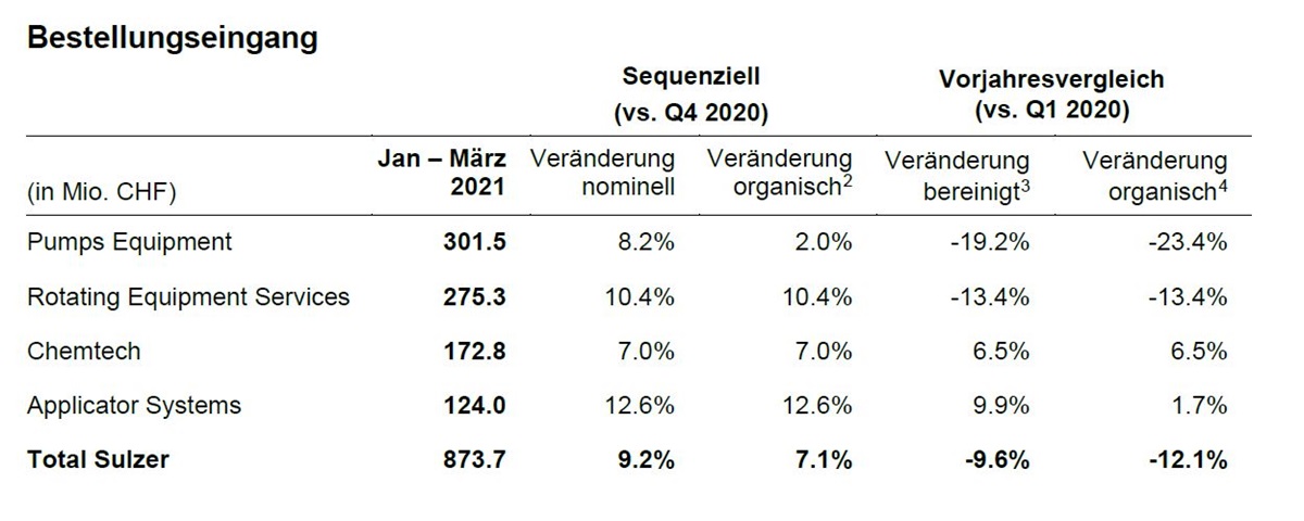 Im 1. Quartal 2021 stieg der Bestellungseingang um 9.2% (7.1% organisch) und war in allen Divisionen höher als im 4. Quartal 2020, wobei im März 2021 das höchste Auftragsniveau seit mehr als einem Jahr erreicht wurde. Verglichen mit dem Rekordniveau des Bestellungsseingangs im 1. Quartal 2020, unserem letzten Quartal vor der Pandemie und dem höchsten in über fünf Jahren, sanken die Bestellungen um 9.6% (12.1% organisch). Währungsumrechnungen hatten einen negativen Einfluss von CHF 24.7 Mio. gegenüber dem Vorjahreszeitraum, während Akquisitionen einen positiven Beitrag von CHF 25.4 Mio. leisteten.