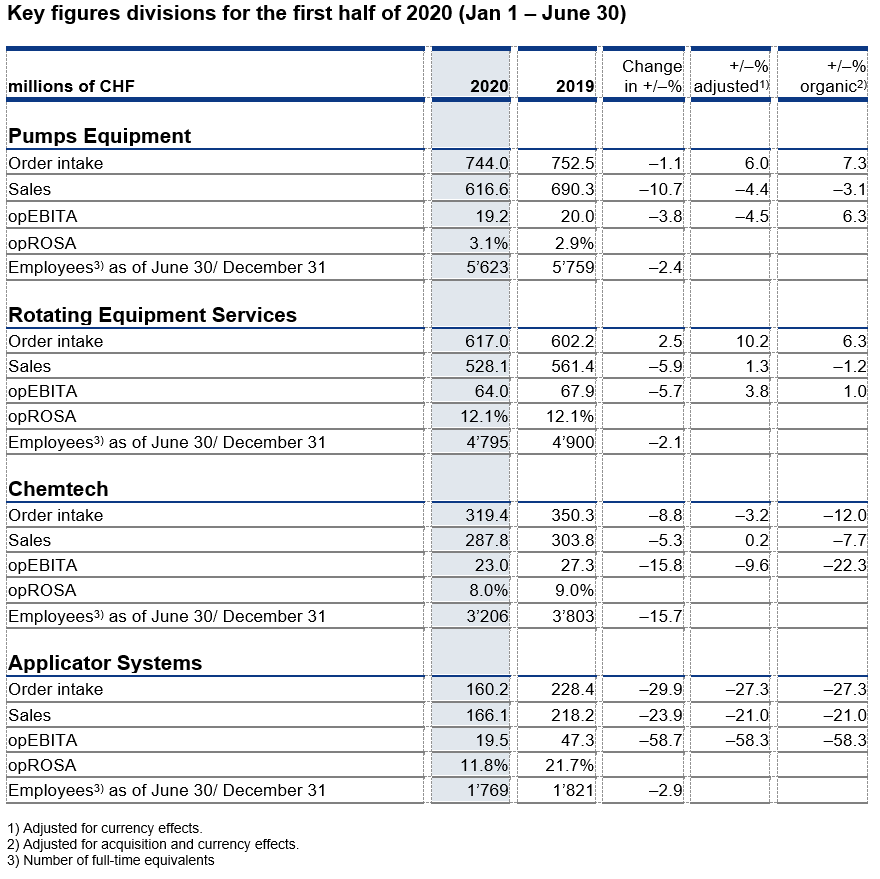 Customer confinement measures such as limited site access and temporary closures of factories and front-end outlets impacted sales. Sales in Rotating Equipment Services grew by 1.3%, supported by the Alba acquisition. Pumps Equipment’s sales declined by 4.4%. Higher sales in the Water segment could not offset the decrease in Energy and Industry. In Chemtech, sales remained stable, despite a significant COVID-19 impact including the six-week lockdown of the Indian factory from the end of March until the beginning of May. In Applicator Systems, sales declined by 21.0%, caused by the abrupt closure of retail stores and dental clinics globally.