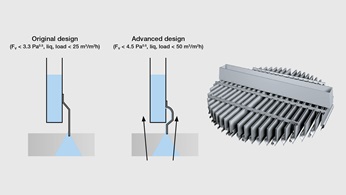 MellapakPlus has enabled the columns to handle much higher throughput which was an impossible task by a trayed column even with the Mellapak column. The design of the internals which were made for Mellapak column must stand the test of higher vapor load with MellapakPlus column. The standard baffle in the VEP tends to have entrainment at higher vapor loads. We made improvements to the baffle design of the VEP liquid distributors (Fig. 5). It helped to compliment the MellapakPlus column to provide the best possible solution for the Styrene application.
