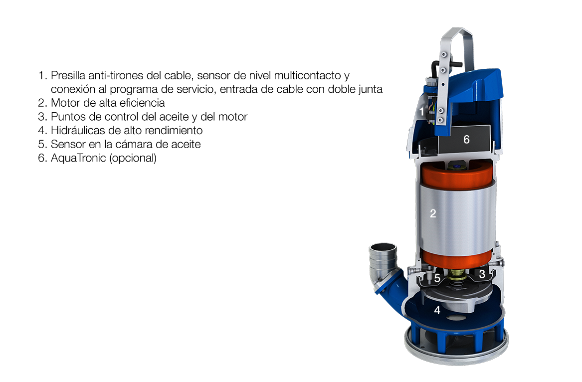 - Bombeo sin riesgo de obstrucción con bombas diseñadas para bombear lodos y agua con sólidos en suspensión.